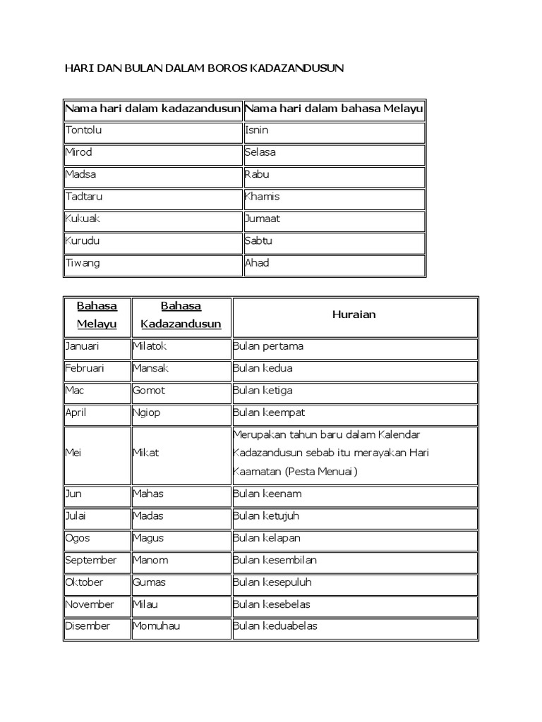 Hari Dan Bulan Dalam Boros Kadazandusun