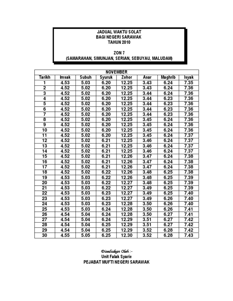 Jadual Waktu Solat Bagi Negeri Sarawak Tahun